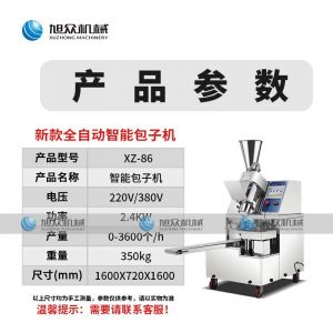 名稱86智能版包子機 電源220/380v 功率2.4kw 產量 尺寸1600*720*1600mm 重量350kg 規格20-150克/只 其他